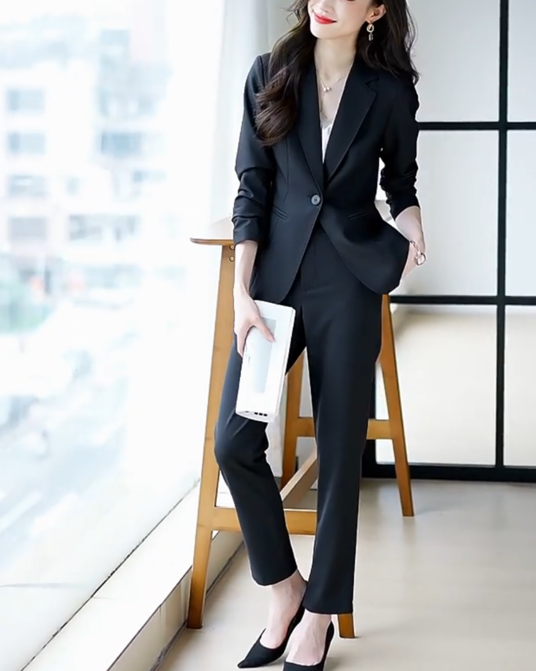 すっきりしたパンツとのセットアップで、脚をすらりと見せるきれいなシルエット。