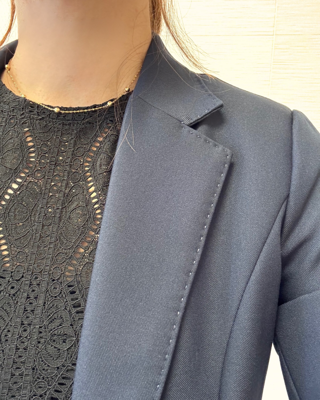 スーツの“顔”ともいえる襟(ラペル)部分のさりげないステッチは、顔まわりの印象をシャープに整え、上品なきちんと感を演出。