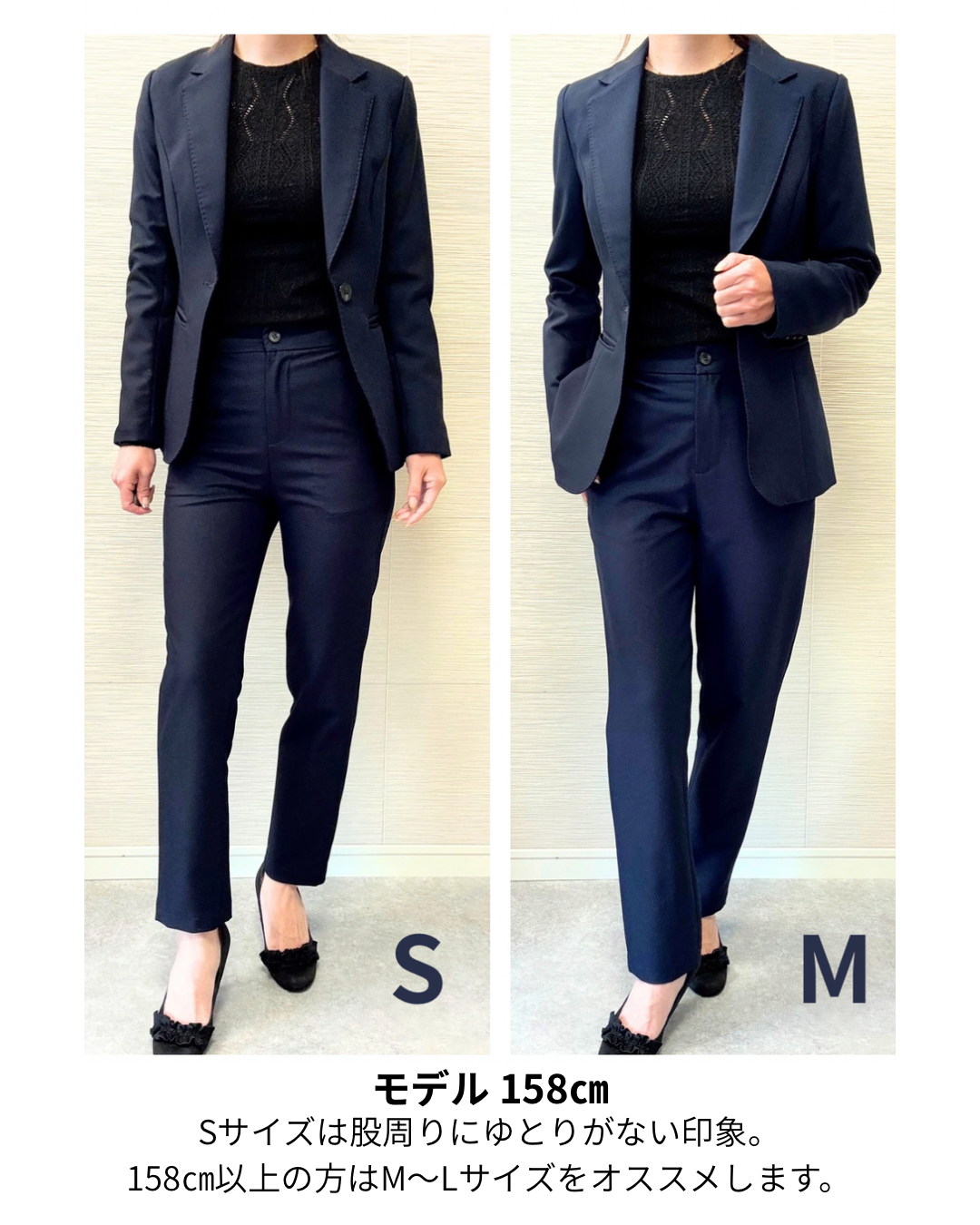 パンツのウエストは背面ゴム仕様で、長時間の会議や商談でもこっそりラクに。